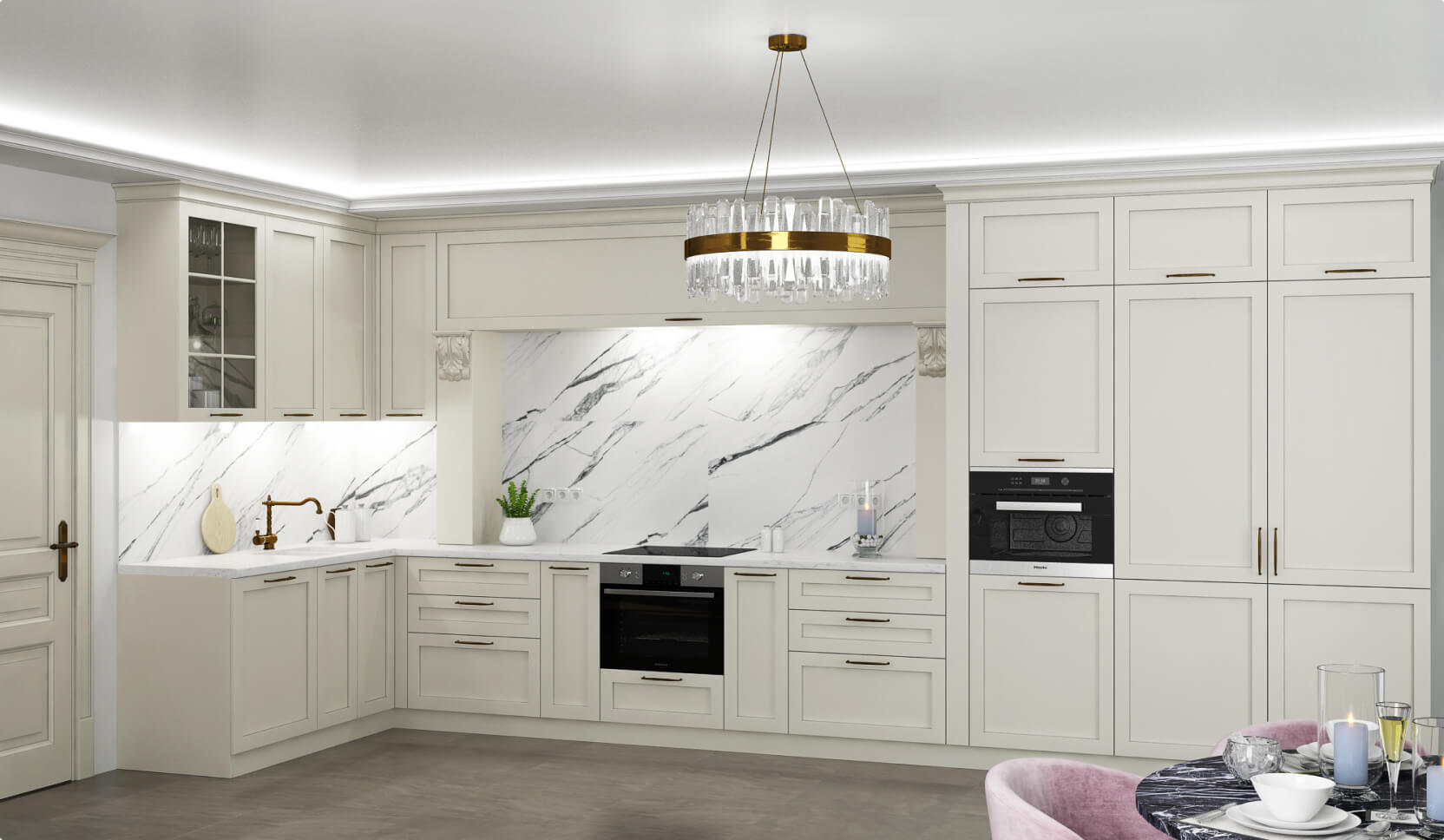 Особенности: Кухня в стиле Неоклассика в светлых серых тонах – замечательное решение для просторного светлого помещения. Дизайн Неоклассика отлично подойдет для большой семьи живущей в дорогих апартаментах, частном доме или особняке. Строгие классические формы фасадов и столешниц, традиционные материалы и фактуры. Столешницы и стеновая панель из современных высококачественных материалов. Бытовая техника органично вписана в группу высоких шкафов с антресолями под потолок. Варочная панель встроена с удобным расположением на столешнице - свободное пространство для приготовления пищи по обе стороны от панели.