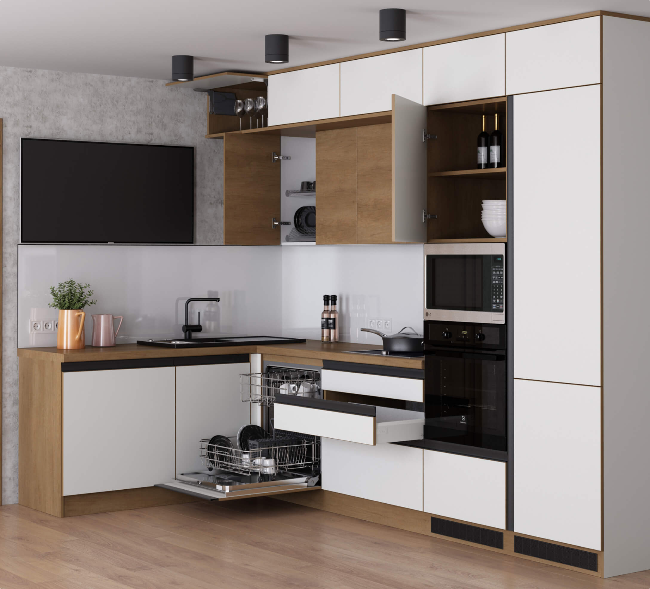 Особенности: Кухня исполнена в трендовом сером цвете. Урбанистический дизайн с исполнением фасадов серо-белых тонов выглядит очень стильно и современно. Пластик, из которого сделаны фасад - это уникальный продукт, обладающий всеми необходимыми качествами идеальных кухонных поверхностей. А его матовый материал приятно удивит Вас тактильным эффектом. В данной кухне возможна комплектация с различными типами ручек Schuco, которые наиболее гармонично впишутся в серую цветовую гамму. Эта матовая кухня в современном стиле весьма динамична и стимулирует шагать навстречу всему новому. Такая кухня подойдет как для маленького помещения, так и для просторных частных домов.